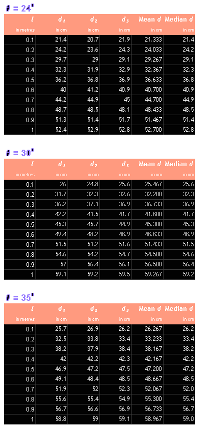 ResultsHere are the results from the experimental tests, averages of mean and median are also shown. Values are listed against l and each value of q is contained in a separate table as the is a fixed value. Metres are the units for l as this unit of measurement will be used for the theoretical modelling, as experimental results were taken in centimetres these are used for values of d.