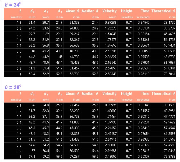 Time t can be found with h being inserted into d. h = vtsin q + ½gt2 vtsin q + ½gt2 – h = 0 Treat as a quadratic equation: t = Now that t has been found it can be inserted into d (vtcos q ) to give theoretical results for fixed values of q and changing values of l. d = v As there are a large number of calculations it would save time if d was found by an automated method. The following tablulated results of theoretical d were found using MS Excel, a spreadsheet.