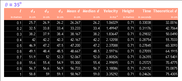 The radian instructions convert degrees from the default radian angles. In the theoretical formula the answer is normally in metres, but in this case the answer is multiplied by 100 to give it in centimetres for comparison with the experimental data. There is one reason why the experimental data was taken in centimetres, it is the scale used on the rulers where the ratchet socket lands on the floor. This will have no negative effect on any formulae as values of d can be easily converted back into metres and vice versa with no reduction of quality. |